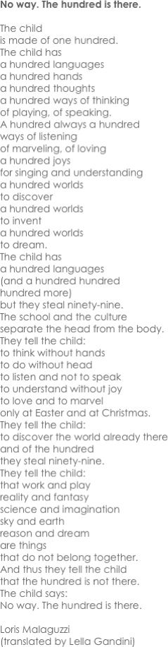 Children’s investigations develop from careful observation of children’s interests by the teachers and build into projects from which children and teachers toss ideas back and forth through invitations to explore, provocations to inspire, and proposals to discuss. Teachers and children both play the role of protagonists, scaffolding learning to a new level. Children are given the highest-quality materials to explore, and art mediums are used as an extension to thought so children can represent ideas through various mediums and multiple intelligences.
